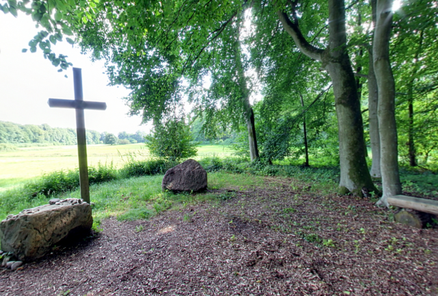 Der Andachtsplatz mit Bänken, einem Holzkreuz und einem Stein, auf dem die Urne ruhen darf, fügt sich nahtlos in die Stille des Waldes ein.