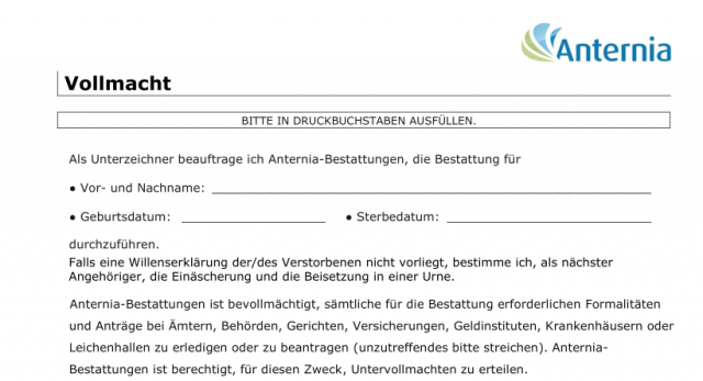 Im Letzten Teil des Vertrags bevollmächtigen Sie das Bestattungshaus die Bestattung in Ihrem Namen und nach den vertraglichen Vereinbarungen durchzuführen. Die Vollmacht benötigt der Bestatter, um für Sie Amtsgänge zu erledigen und mit dem Beisetzungsort in Kontakt zu treten.