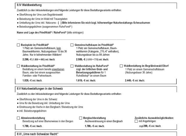 In diesem Abschnitt informiert der Vertrag über die möglichen Bestattungsformen und ihre Preise. Auch zusätzliche Leistungen wie eine Trauerfeier, Blumen oder besondere Wünsche werden hier vermerkt. Sie haften rechtlich und finanziell für alle angegebenen Produkte und Dienstleistungen, wenn Sie diesen Vertrag unterschreiben, also stellen Sie sicher, dass alle Informationen korrekt und vollständig sind. Lesen Sie die Vertragsbedingungen gründlich. Sie sollten sich genau darüber im Klaren sein, was Sie unterschreiben, genau wie bei jedem anderen Geschäft. Stellen Sie ihrem Bestatter alle Fragen, bei denen Sie sich nicht sicher sind. Einige Positionen könne nachträglich ohne großen Aufwand noch geändert werden, es vergehen einige Tage oder Wochen bis der oder die Verstorbene schließlich beigesetzt wird. Trotzdem sollten Sie sich im Klaren darüber sein, dass zum Beispiel eine bereits erfolgte Kremation einige Bestattungsformen ausschließt.